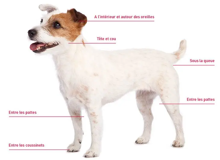 Les nuisibles sont petits mais on peut les surveiller. L’illustration ci-dessous indique les zones où les parasites sont les plus susceptibles de se cacher. Pensez à contrôler votre chien après chaque promenade pour repérer un parasite le plus rapidement possible.