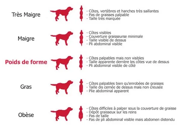 Vous voyez votre loulou tous les jours donc il est difficile de se rendre compte s'il a quelques kilos en trop; il est possible que ce soit lorsque le vétérinaire le remarque que vous vous en rendiez compte. Si vous n'arrivez plus à sentir la colonne vertébrale de votre chien ou s'il est moins actif qu'en temps normal, il est probablement en surpoids. Vous pouvez vous référer au schéma ci-dessous pour avoir une idée mais si vous n'êtes pas sûr, demandez directement à votre vétérinaire, il pourra vous renseigner et vous guider pour faire perdre du poids à votre animal.