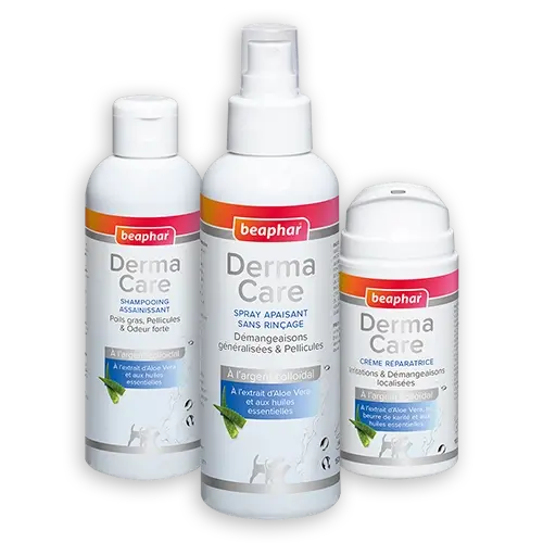 La gamme dermatologique DermaCare de Beaphar se compose de 3 produits adaptés aux chiens et aux chats :