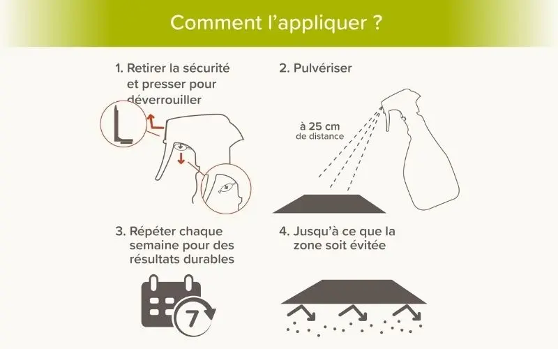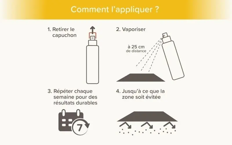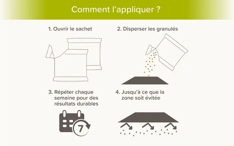L'odeur désagréable pour nos animaux les incite à ne pas s'approcher ni détériorer les zones traitées. Au fil du temps, ils finissent par apprendre qu'ils doivent éviter ces zones.