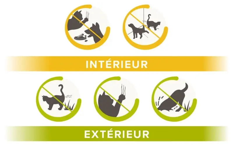 - Après une semaine d'application, en moyenne, les chats évitent la zone traitée dans +90% des cas et les chiens dans +97% des cas.